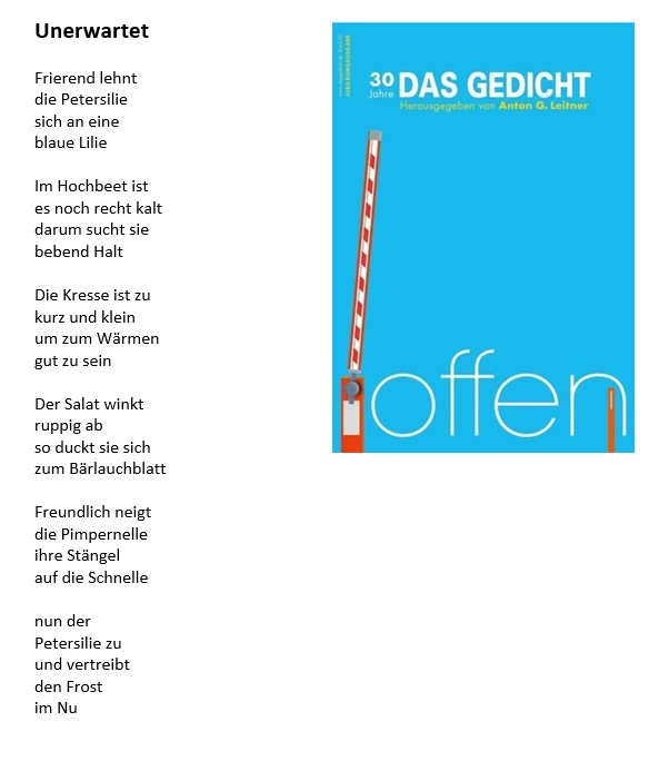 Weitere Gedichte 2023: „Am letzten Zipfel deines Selbst“ ( S. 84) / „Ganz still“ (S. 86), ausgewählt „Ich nehme“ (S. 90)
